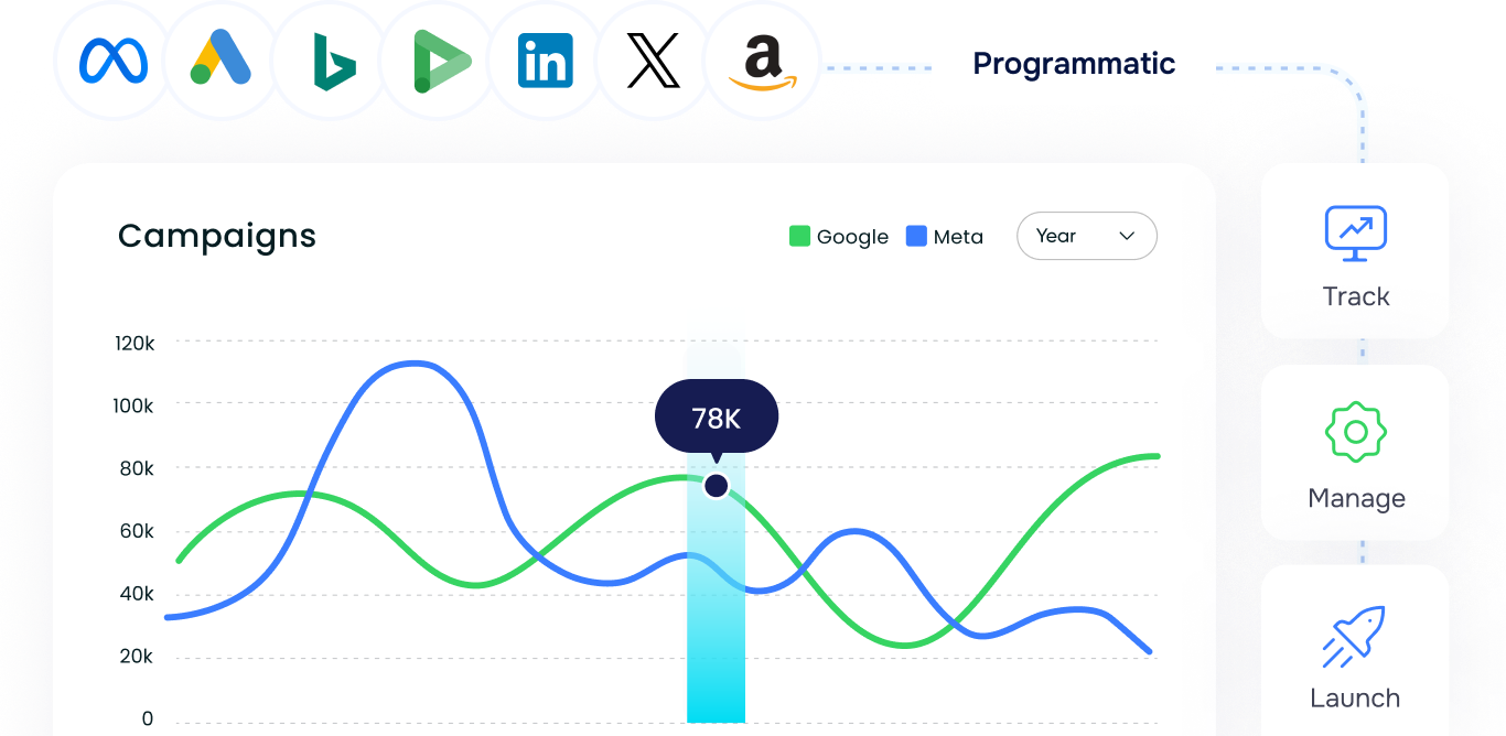Launch and manage campaigns across Google, Meta, Amazon, and programmatic platforms directly within mFusion.